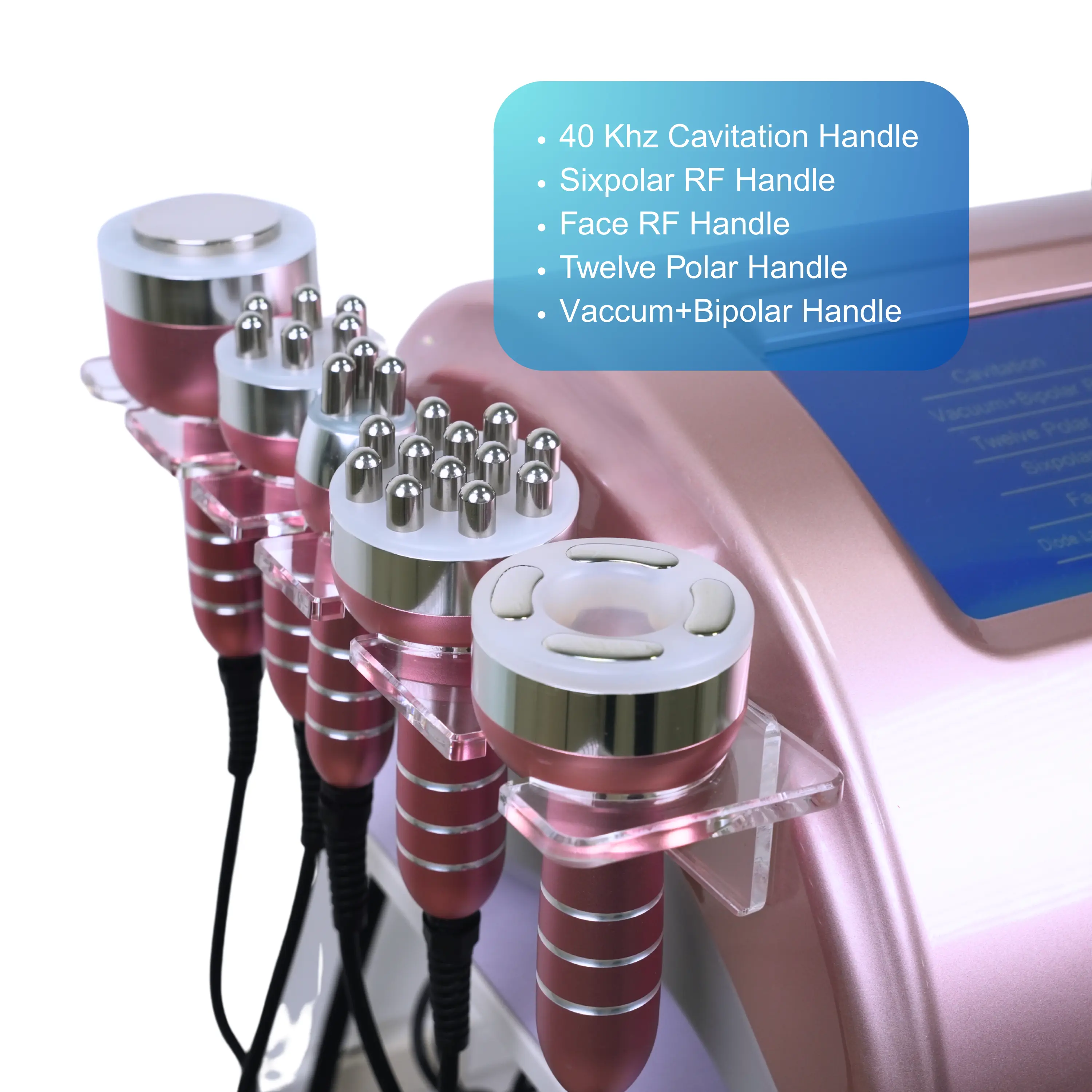 Probes: Multipolar RF Probe, 40KHz Cavitation Probe, Vacuum Bipolar RF Probe, Sixpolar RF Handle ,Face RF Handle