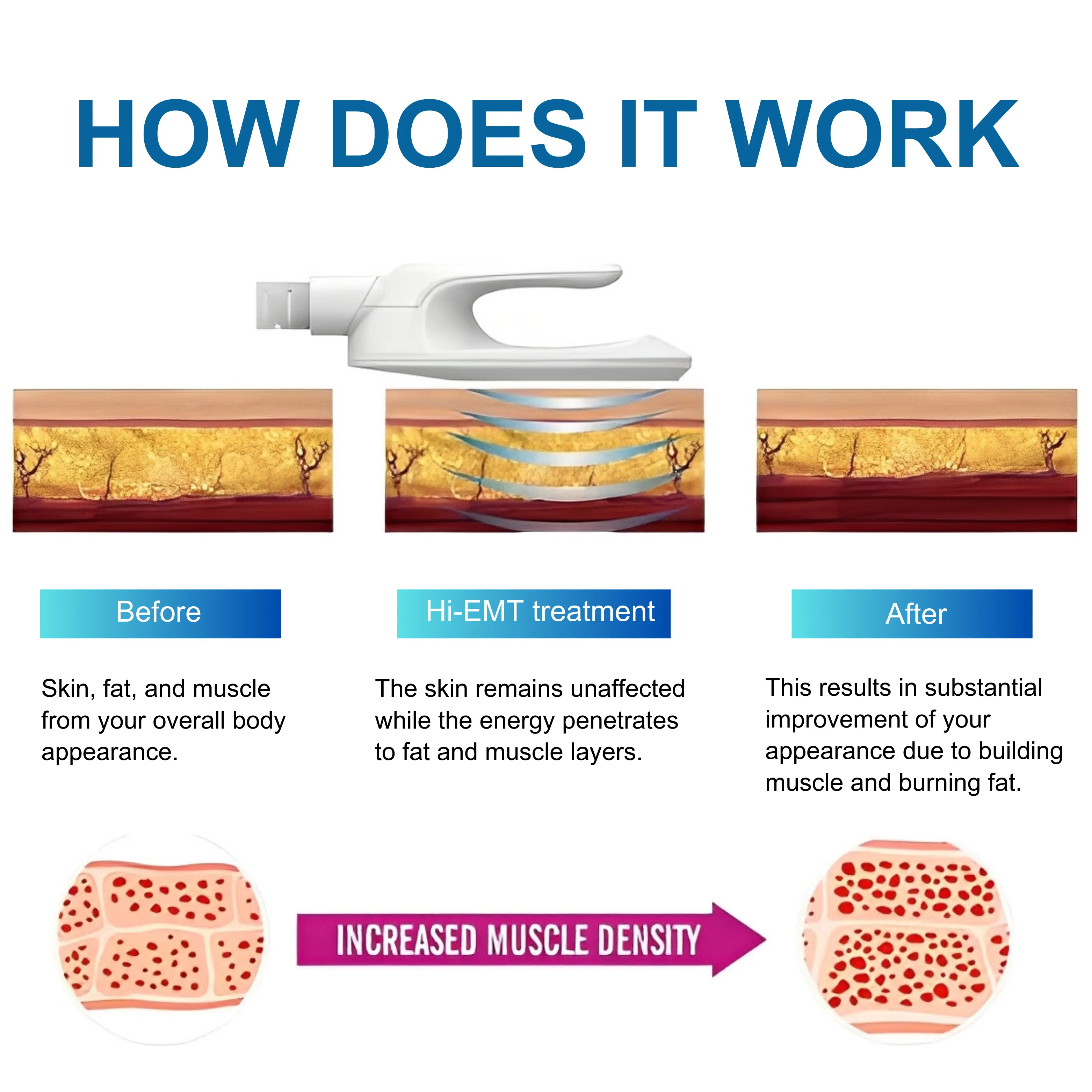 HI-EMT triggers deep muscle contractions in the targeted areas, promoting new muscle fiber growth and increased muscle volume. Treat your abs, inner thigh muscles, arms, biceps, triceps, and other stubborn fat accumulations without pain and tears.