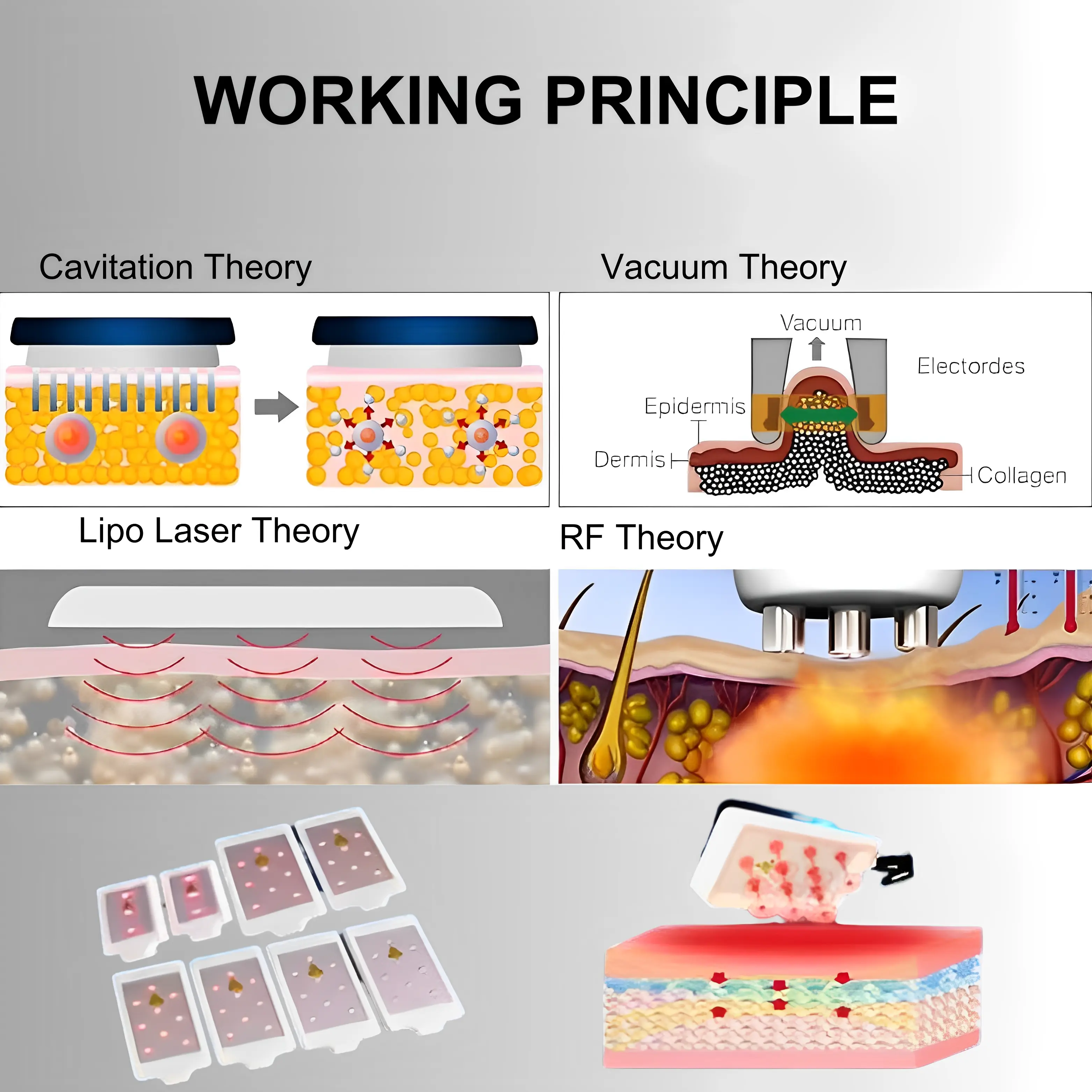 Cavitation Effect: Utilizes 40KHz ultrasound vibrations to rapidly shake fat cells, creating friction and heat, thereby burning calories and moisture, leading to reduced and ruptured fat cells.