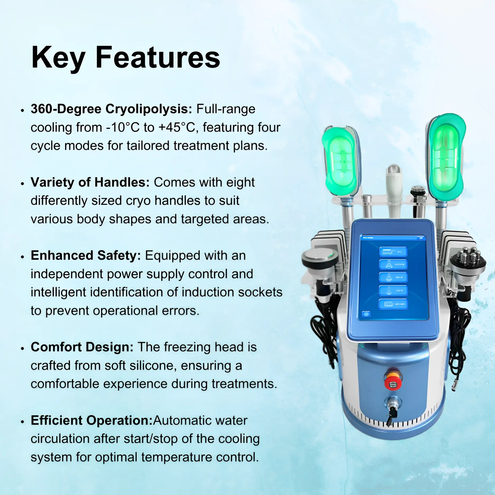 360-Degree Cryolipolysis:Full-range cooling from -10°C to +45°C, offering four cycle modes to accommodate personalized treatment plans.